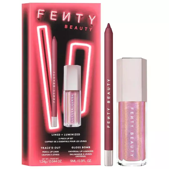 Perfila y brilla. El Trace’d Out Lip Liner en el tono rosa malva más vendido RiRi se une al Gloss Bomb en un nuevo tono púrpura holográfico, Grape Splash.